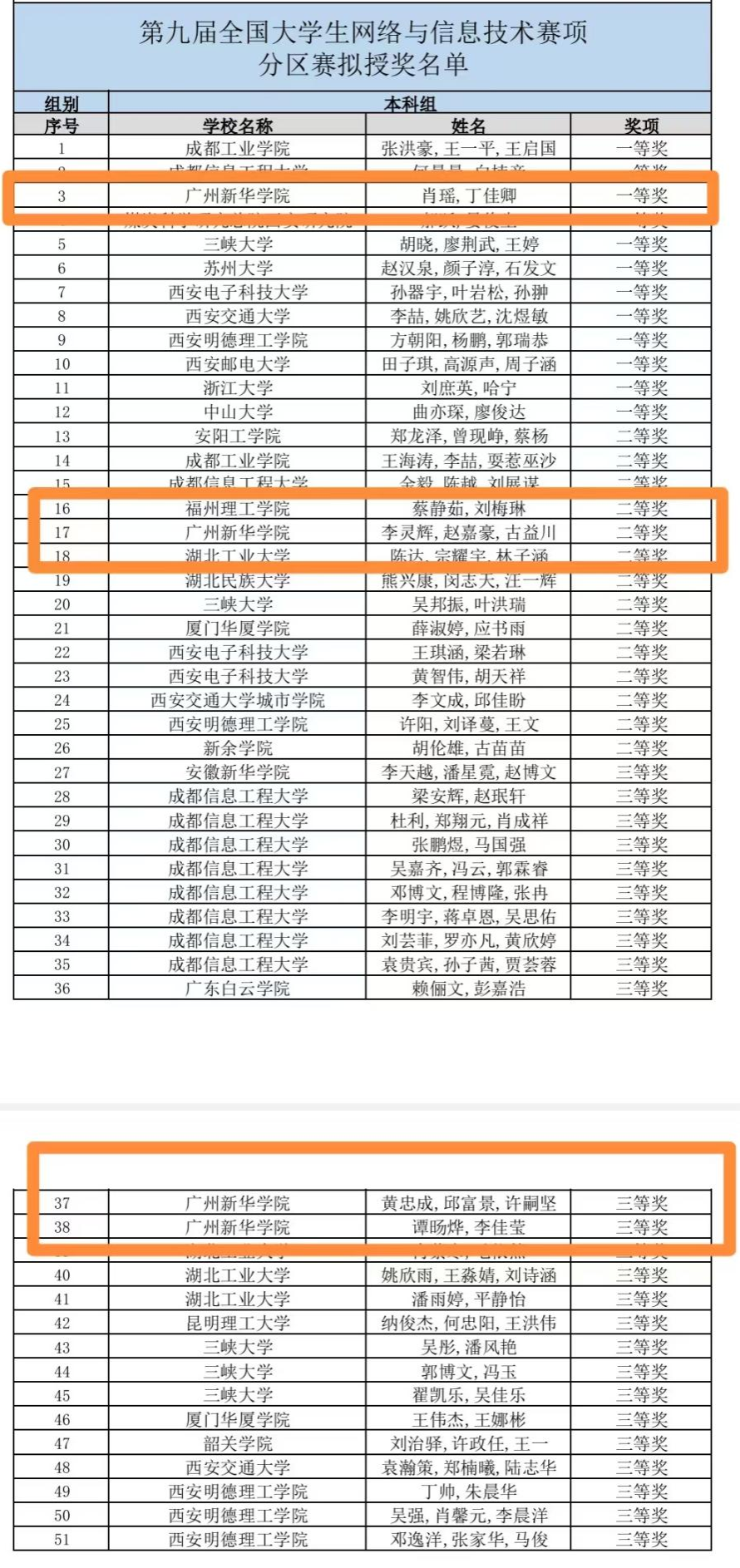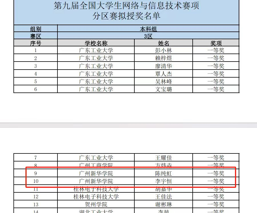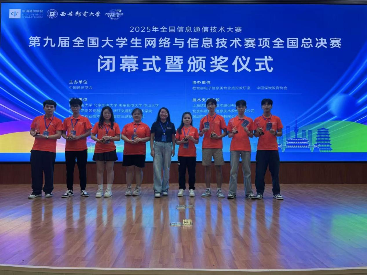 2025年8月21日-23日,第九届全国大学生网络与信息技术大赛全国总决赛在西安邮电大学圆满落幕。本届大赛共吸引了来自全国500多所高等院校的近万名学生参赛。赛事共设三大赛道,分别是5G网络工程实践赛、光宽带网络工程实践赛以及数字化场景设计与开发赛。本次全国总决赛,在信息与智能工程学院指导老师梁立容老师的带领下,我校学子在多个赛道中脱颖而出,取得优异成绩,共有5只队伍共计8人荣获国家级三等奖。其中,22级电子信息科学与技术陈纯虹、23级电子信息科学与技术李宇恒获荣本科组赛道一“5G网络工程实践赛”全国总决赛三等奖;23级电子信息科学与技术李杰武荣获本科组赛道二“光宽带网络工程实践赛” 全国总决赛三等奖;23级电子信息科学与技术李灵辉、赵嘉豪、古益川(队伍一)、23级电子信息科学与技术肖瑶、丁佳卿(队伍二)荣获本科组赛道三“数字化场景设计与开发赛”全国总决赛三等奖。