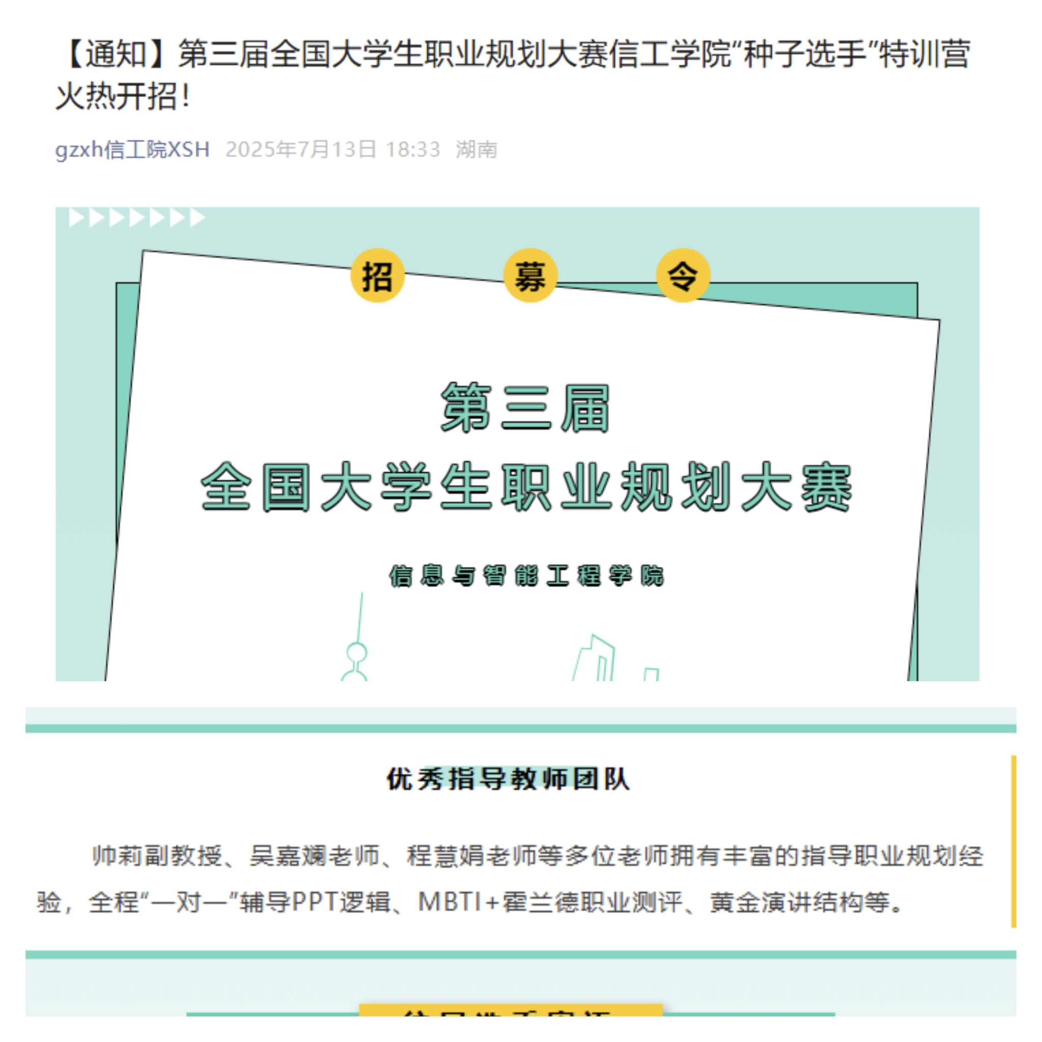 学院高度重视本次职业规划大赛的筹备与组织工作,提前统筹部署,构建形成“选拔-培育-指导-推选-参赛”的完整育赛闭环。7月13日起,通过线上宣传、线下辅导员走访动员等多形式组织各年级学生报名参赛,累计收到30名学生的报名。