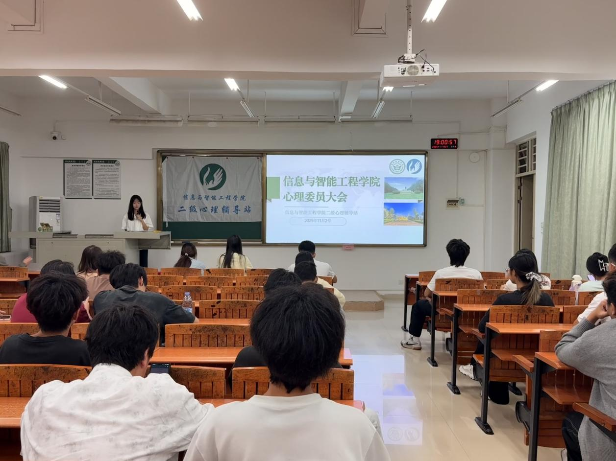 为进一步强化学院心理健康教育工作体系,明确心理委员工作职责与使命,充分发挥心理委员在学生心理健康服务中的“前哨”作用。2025年11月2日,信息与智能工程学院顺利召开全体心理委员大会。二级心理辅导站站长程慧娟老师、二级心理辅导站学生站长杨紫妮、社区助理辅导员以及全体班级心理委员参加会议,会议由社区助理辅导员杨金月主持。