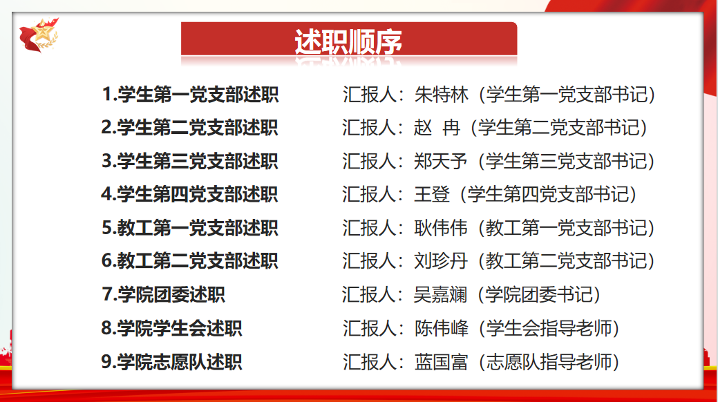 会议第一项,各组织汇报人按照述职顺序依次进行述职。述职过程中,各组织汇报人认真总结2025年工作,并结合实际深入剖析存在的问题,明确改进方向,提出切实可行的整改措施。