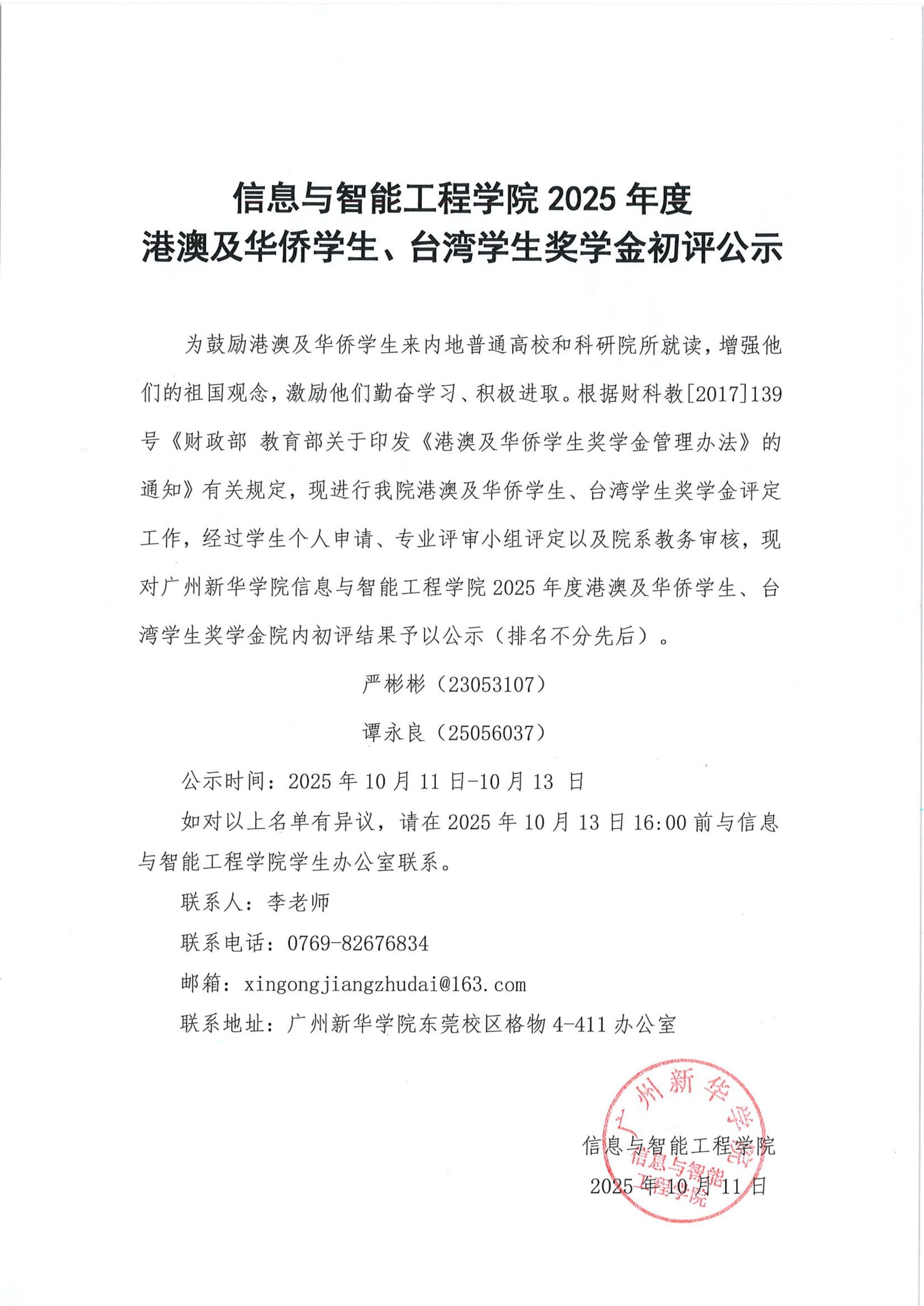 【公示】信息与智能工程学院2025年度港澳及华侨学生、台湾学生奖学金初评公示