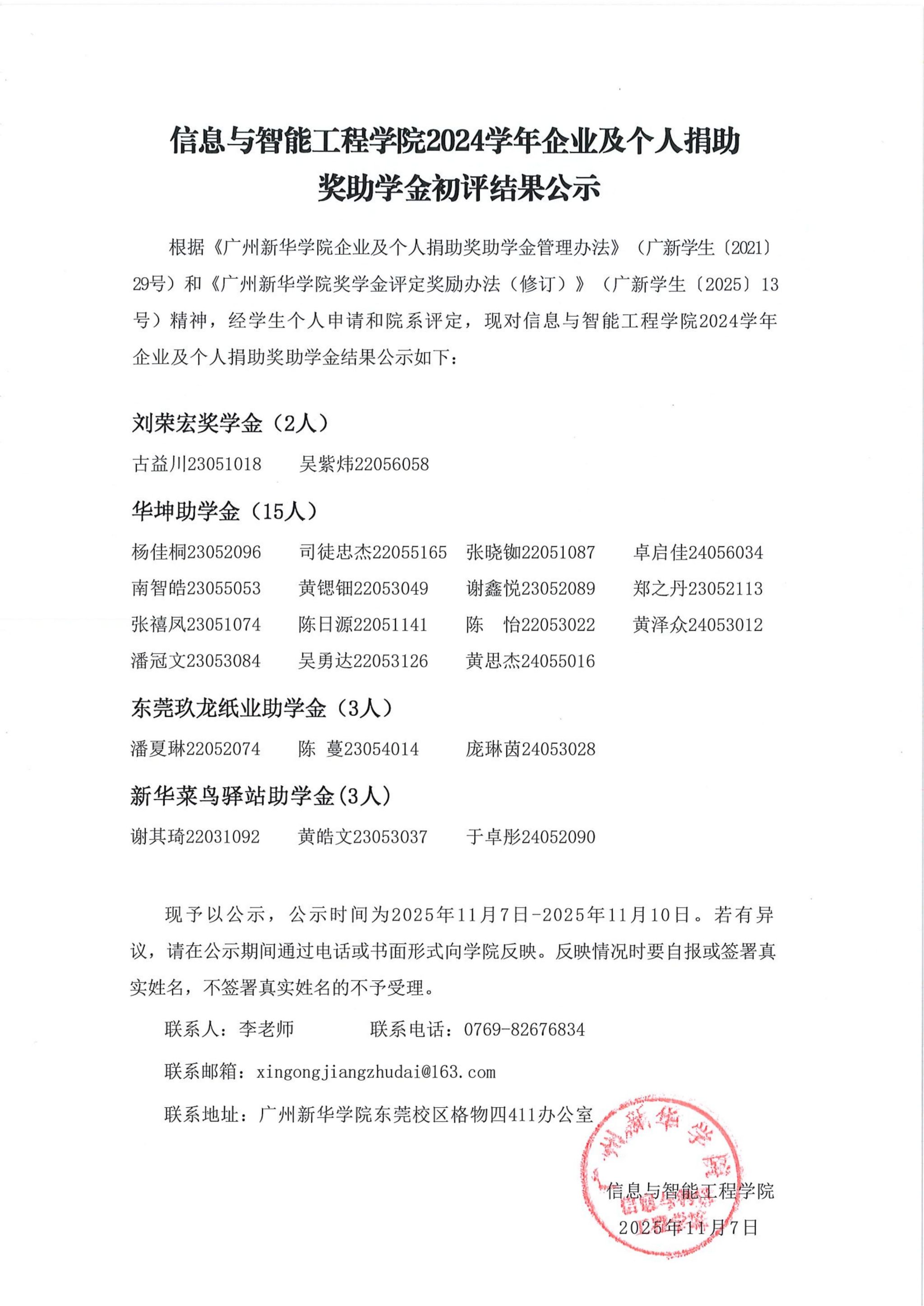 【公示】信息与智能工程学院2024学年企业及个人捐助奖助学金初评结果公示