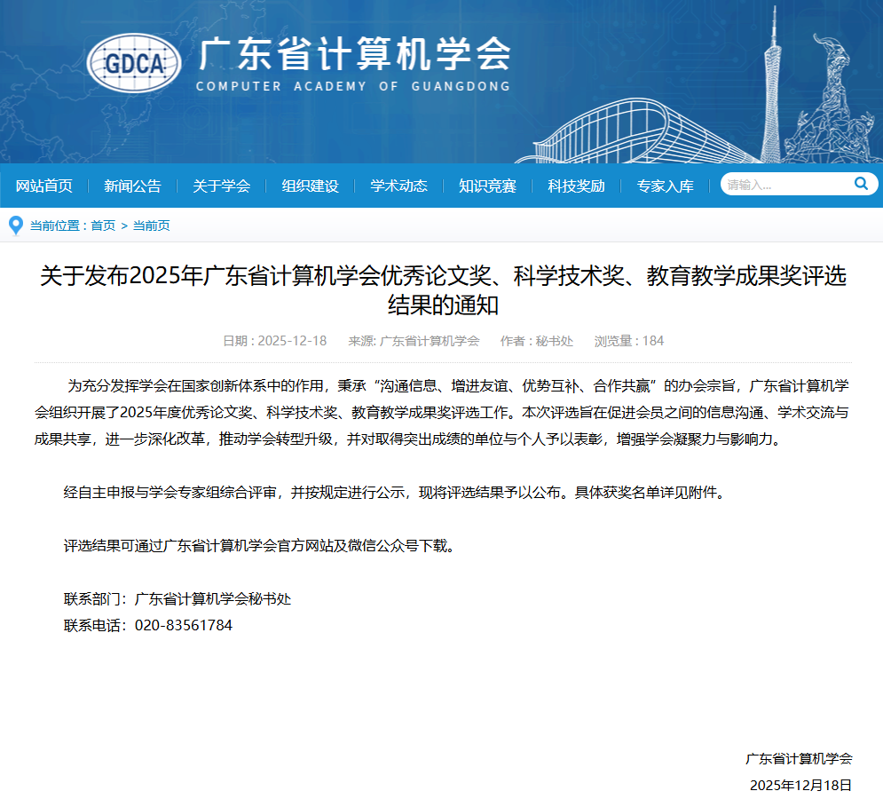 近日,2025年广东省计算机学会高等教育教学成果奖获奖名单正式公布。信息与智能工程学院(以下简称“信工学院”)教师团队(核心成员:高鹰、唐俊、王辰尹、王玉娟、陈翰滔、邱泽敏、衣杨)申报的《产业学院赋能软件工程专业创新人才培养的探索与实践》成果,经过激烈角逐与严格评审,最终荣获二等奖。