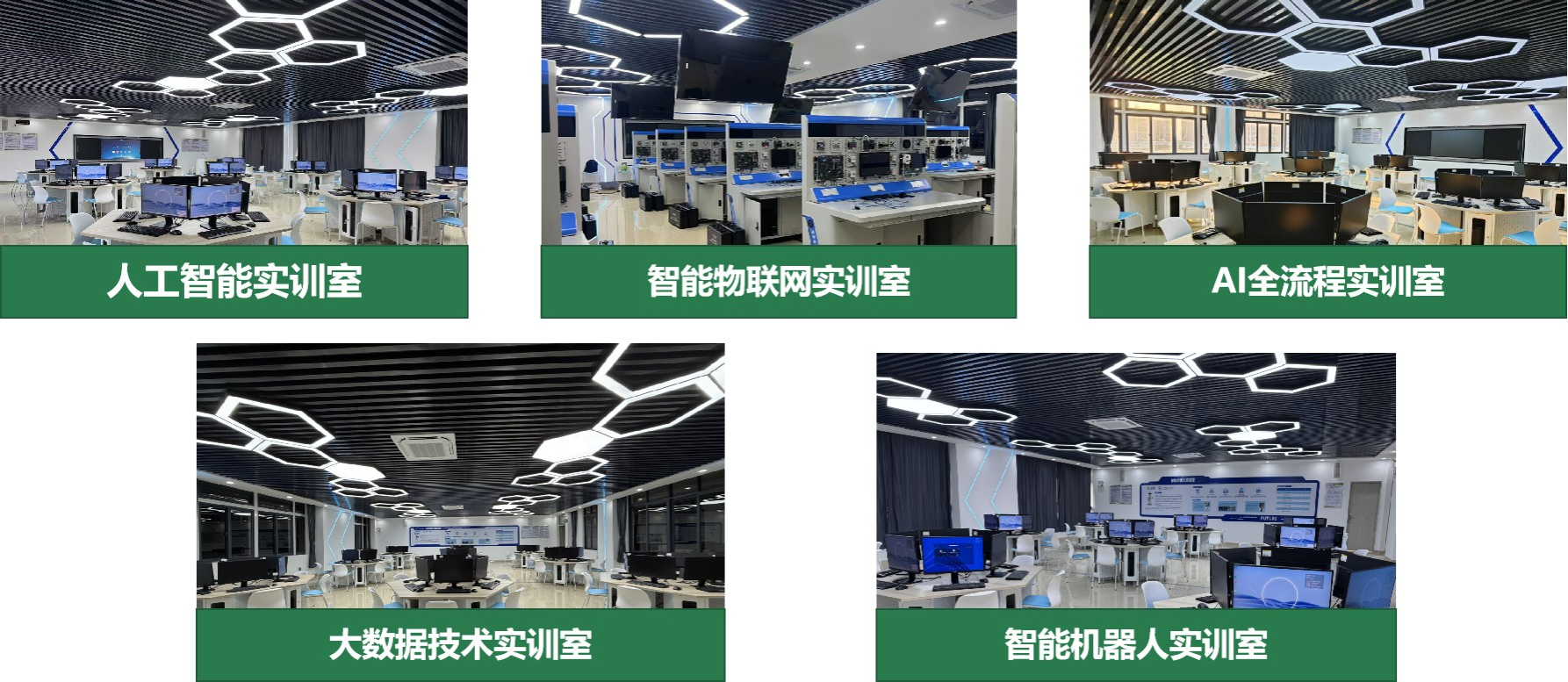 产业学院立足行业前沿技术需求,累计建成5大智能化实训室,包括:人工智能实训室、大数据实训室、AI全流程实训室、智能机器人实训室和智能物联网实训室,构建起“技术支撑-场景实训-产业融合”三位一体的实践育人体系,着力培养符合产业需求的创新型人才。